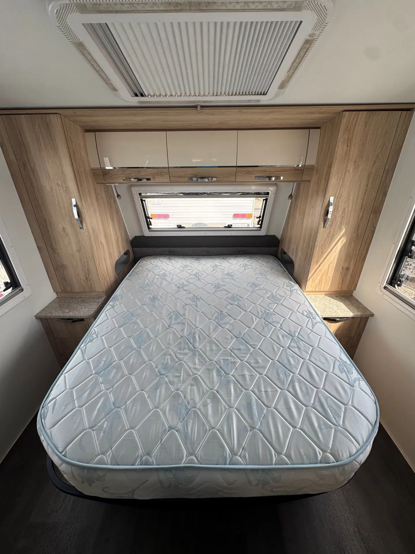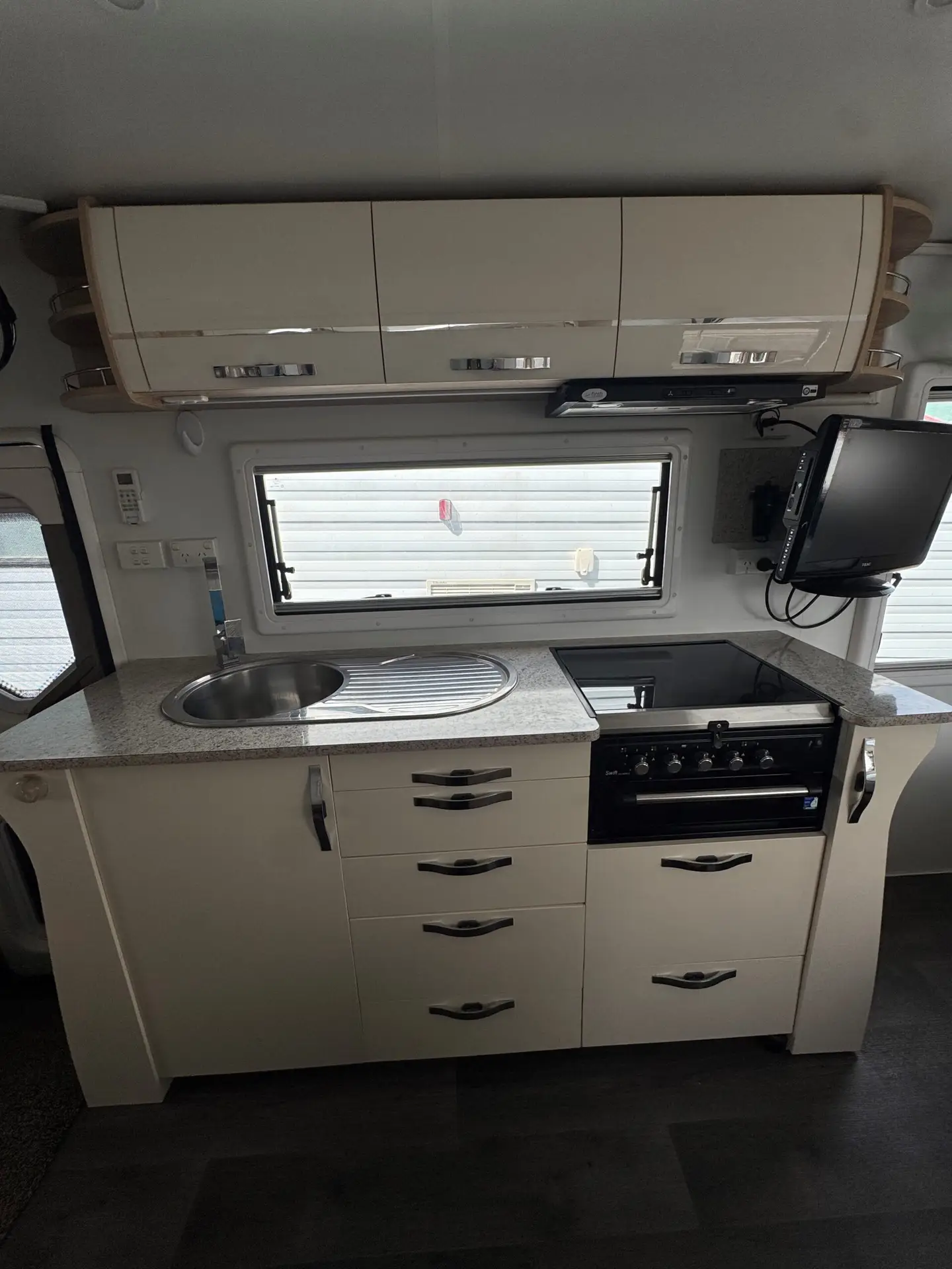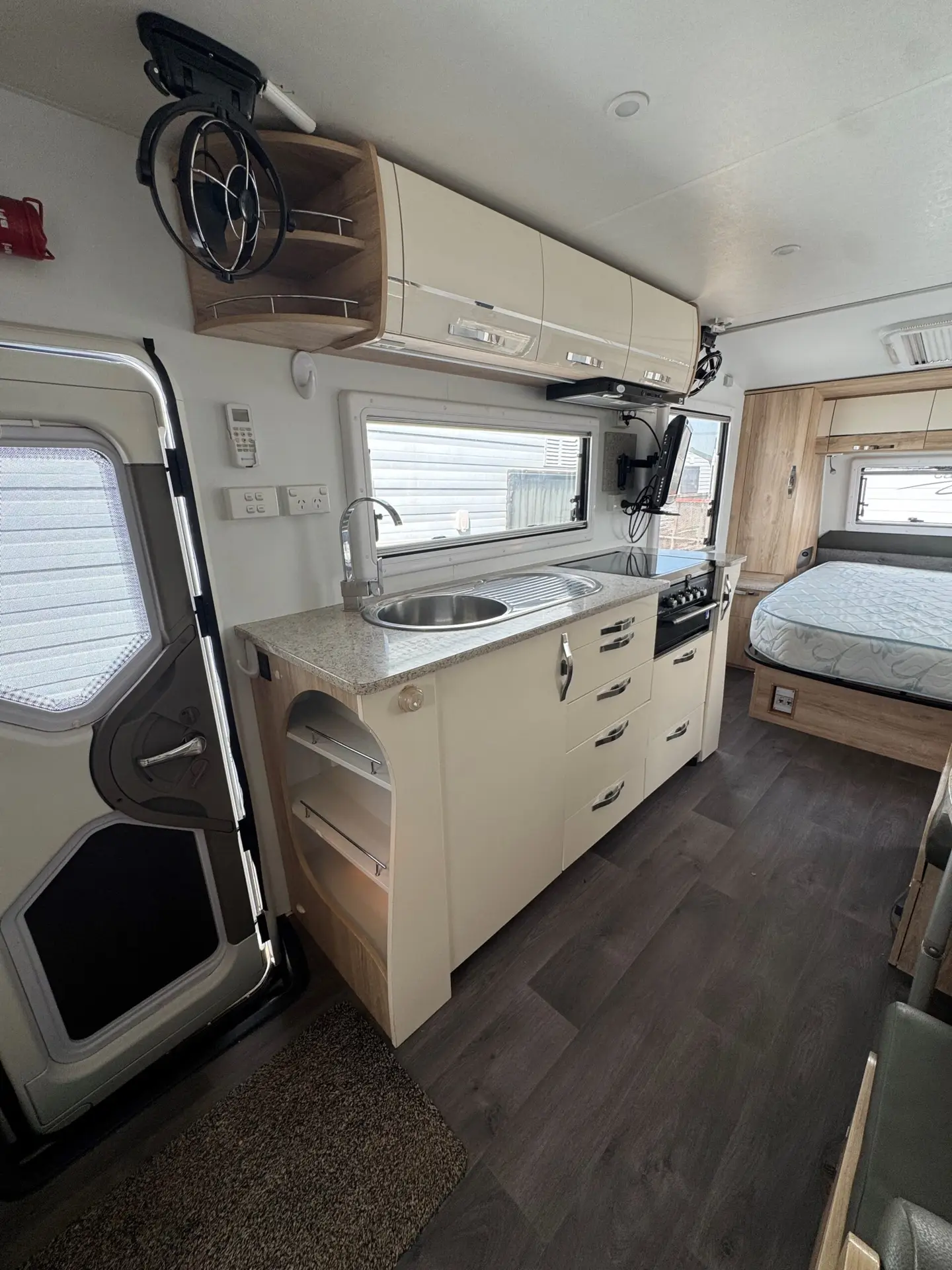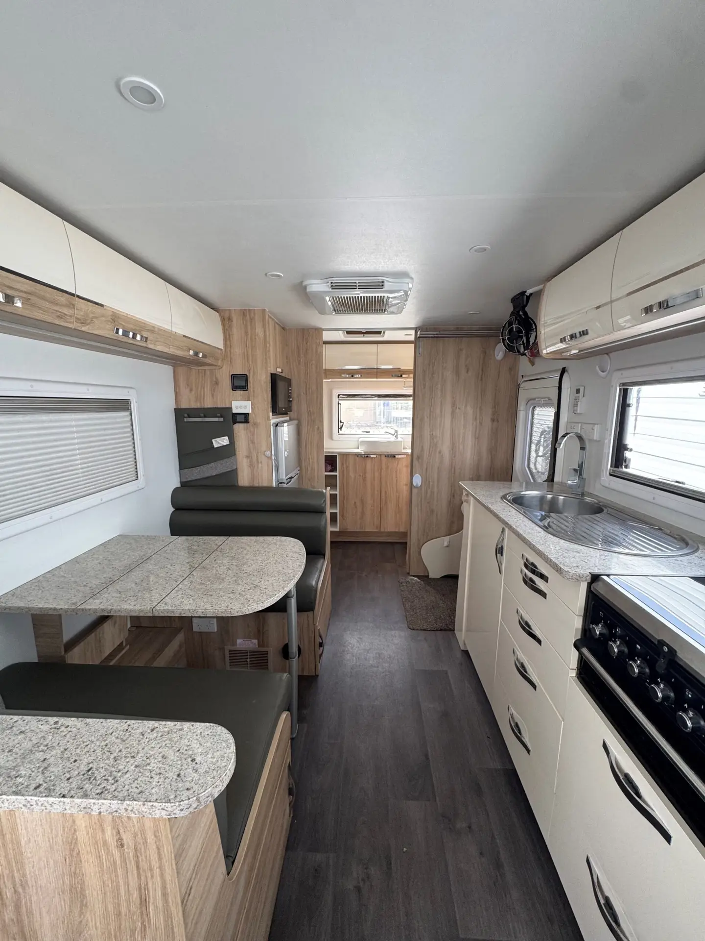 Colour: White Rego: S319TLF ATM:2255 Features: DO – 35 Hitch Alko Enduro Suspension 2000W Solar Inverter Rear Camera Roll out Awning External TV Point Reverse Cycle Air conditioner Deisel Heater Cook Top & Grill Double Bed Booth Seating Dining area Separate Shower, Toilet & Much More Come have a look on site at this caravan!